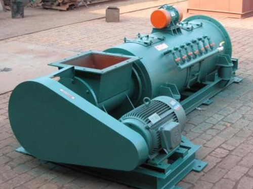 臥式粉塵加濕機工作時,定量的生料粉由下料口流入攪拌槽中,經(jīng)若干個具有一定壓力的水(20kp)霧化灑向生料粉,由定性長度的軸經(jīng)攪拌均勻后,形成大小不等松散的球核,將整個攪拌機的攪拌時間分為三個區(qū)域,即霧化區(qū)、攪拌區(qū)、卸料區(qū)。這樣使料粉在充分濕潤又松散的狀況下完成它的工作后,迅速地轉入下道工序。
